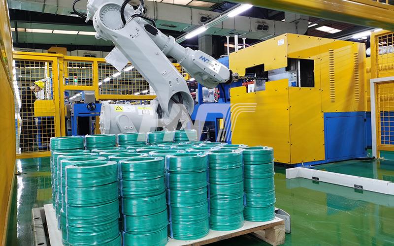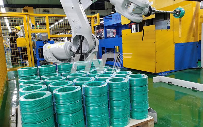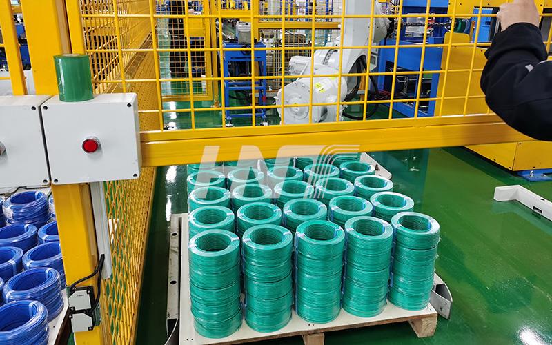 The robotic palletizing system utilizes advanced robotic arm technology to efficiently stack and palletize cable coils. This palletizing system automates the transfer of pallets from the working area and delivers empty pallets to the designated location, reducing the delivery time for the stacking process.